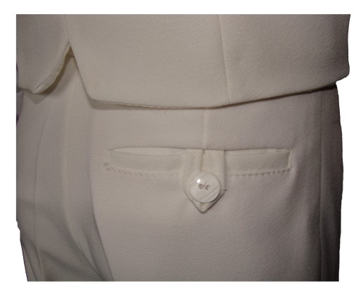 Spodnie posiadają z obydwu boków dodatkowe patki na dwa guziki, które pozwalają regulować szerokość pasa. Zastosowaliśmy to rozwiązanie, rezygnując z gumek, ponieważ z definicji mają to być spodnie wizytowe młodzieżowe, a więc najprawdopodobniej pierwsze prawdziwe spodnie garniturowe dla waszego chłopaka.