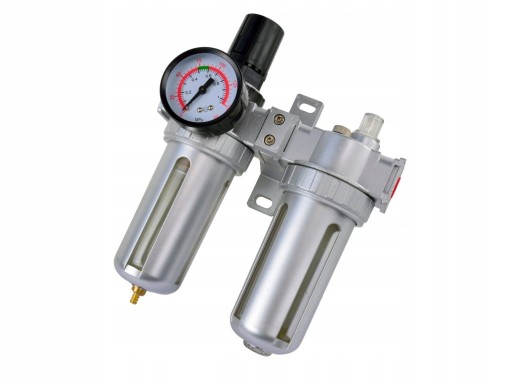 2 elementowy reduktor z filtrem powietrza i smarowaniem. Reduktor z filtrem służy do utrzymania stałego ciśnienia roboczego niezbędnego do poprawnego działania m.in. pistoletów lakierniczych, kluczy udarowych, szlifierek itp. Dodatkowo urządzenie filtruje, odwadnia, odoleja i separuje wszelkie zanieczyszczenia. Idealny do narzędzi wymagających smarowania.