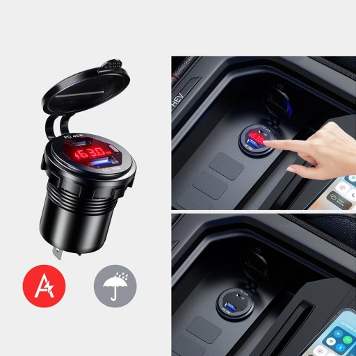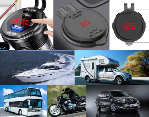 Szybka Ładowarka Motocyklowa Samochodowa 63W 2x USB TYP-C PD 45W Woltomierz