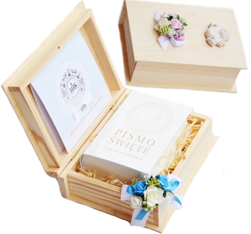 Dekoracja w kolorystyce delikatnego błękitu z białymi i zielonymi dodatkami. W zestawie błękitna Pamiątka Pierwszej Komunii Świętej, która dopełnia piękny wygląd szkatułki, która może posłużyć, jako schowek na biblię, książeczkę świętą, różaniec.