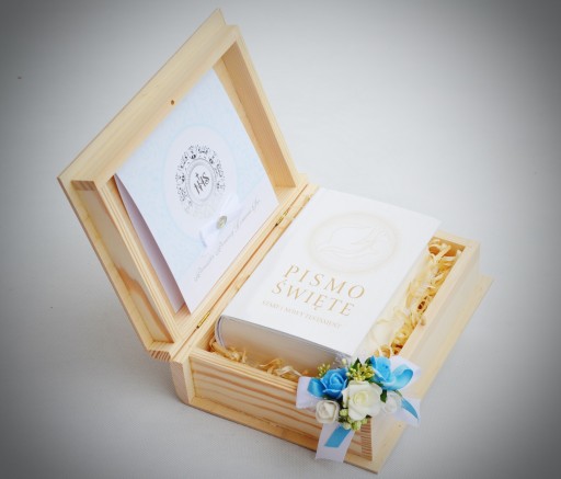 Dekoracja w kolorystyce delikatnego błękitu z białymi i zielonymi dodatkami. W zestawie błękitna Pamiątka Pierwszej Komunii Świętej, która dopełnia piękny wygląd szkatułki, która może posłużyć, jako schowek na biblię, książeczkę świętą, różaniec.