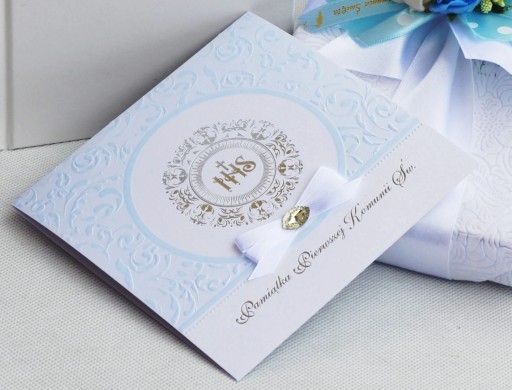 - Pamiątkę Pierwszej Komunii Świętej wraz z kopertą w kolorystyce do wyboru: białej, różowej i błękitnej z wyzłoconymi życzeniami,
