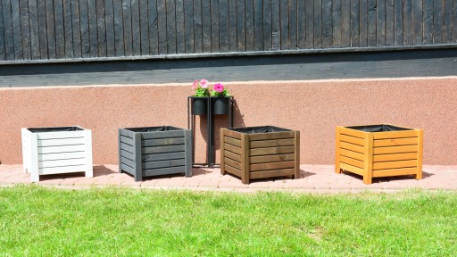- Drewno malowane jest zanurzeniowo, preparatem który oprócz nadania koloru, impregnuje i zabezpiecza donicę przed działaniem warunków atmosferycznych.