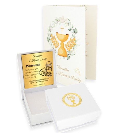 W przypadku zamówienia graweru na komunię, standardowo zapakujemy w pudełeczko komunijne oraz dodamy kartę Pamiątka Pierwszej Komunii Świętej - gratis
