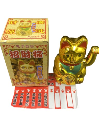 Lewa łapka Maneki-neko na szczęście jest ruchoma (zasilana 1 baterią AA). Kotek macha rączką w górę i w dół, zachęcając do wejścia osoby o czystym i dobrym sercu i intencjach.