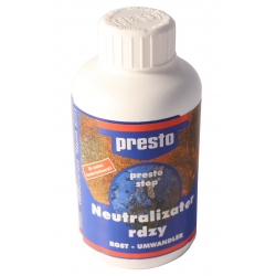 Neutralizator rdzy PRESTO to organiczna emulsja na bazie epoksydowej. Tworzy ona na metaliczno-organiczną warstwę na bazie żelaza. Neutralizator rdzy zwalcza korozję i gruntuje. Środek po wyschnięciu tworzy podłoże do dalszego obrabiania szpachlą i lakierowania. Emulsja zmienia kolor po nałożeniu na czarny. Emulsję nakłada się pędzelkiem znajdującym się w środku.