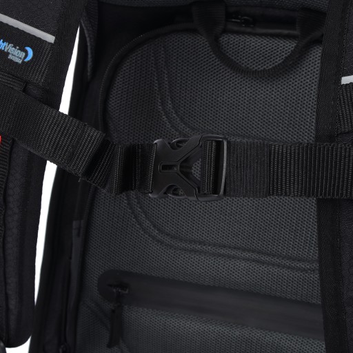 Dyskretne panele odblaskowe Night Vision System rozmieszczono tak, aby motocyklista był widoczny na drodze z każdej strony. W celu zapewnienia doskonałej widoczności po zmroku projekt paneli odblaskowych oparty został na mikrosferycznych drobinkach szkła. Dodatkowo ich dyskretny kształt zgrabnie wpisuje się w elementy konstrukcyjne plecaka. Bryzgoszczelny materiał, z którego wykonano AYRO, sprawia, że zawartość plecaka chroniona jest przed drobnym deszczem i wilgocią, a powłokę zewnętrzną czyści się z łatwością z wszelkich zabrudzeń.