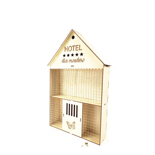 w kształcie chatki, zabezpieczony siatką, która ma dwa zastosowania chroni owady, jaja i larwy przed ptakami oraz zapobiega wysypywaniu się wypełnienia.
