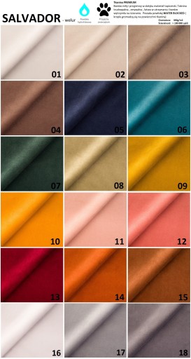 Kolekcja Salvador to bardzo miły i przyjemny w dotyku , mięsisty welur o przepięknej kolorystyce. Charakteryzuje się wysoką trwałością oraz technologią LIQUID BLOCKED. Tkanina trudnopalna , zmywalna , łatwa w utrzymaniu i bardzo wytrzymała na ścieranie.