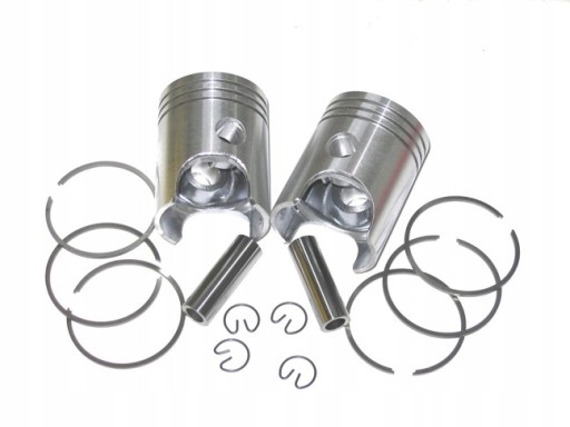 Komplet oryginalnych, czeskich tłoków firmy ALMET do motocykla Jawa 350 serii 638 (TS 350). Wymiar na trzeci szlif: 58,75mm. W skład kompletu wchodzą: tłok prawy, tłok lewy, 6 pierścieni, 4 zabezpieczenia oraz 2 sworznie tłokowe: wszystko to co na zdjęciu. Najlepsza, fabryczna jakość zakładana do dzisiaj na pierwszy montaż w fabryce Jawy: pierścienie oraz zabezpieczenia też czeskie. Sworznie są tajwańskie, polerowane - według fachowców lepsze niż czeskie. Zobacz inne nasze aukcje z częściami: jest pełna oferta czeskich tłoków do Jawy, Jawki i CZ 175/350.