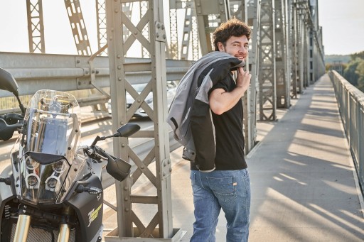 - Pętelka łącząca pozwala sparować je z kurtką motocyklową, a w funkcjonalnych kieszeniach możesz przechować dokumenty lub drobne na kawę.