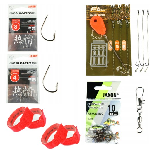 Zestaw karpiowy składający się z gotowych przyponów karpiowych z włosem o długości 19cm, stoperów do kulek proteinowych czy pelletu oraz igły.