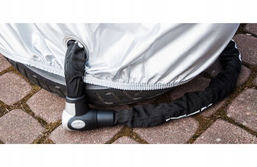 Pokrowiec posiada dwa otwory o średnicy 4 cm, umożliwiające założenie blokady na przednie koło, chroniącą przed kradzieżą motocykla.