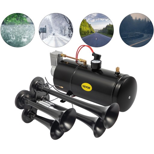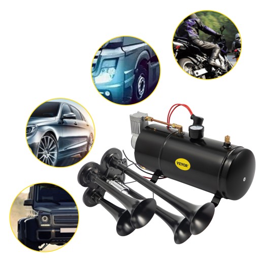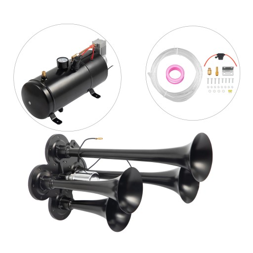 Kompresor z trzema trąbkami wyemituje potężny dźwięk o mocy 150 dB i wyda ostrzeżenie, którego nie można zignorować. Jest przeznaczony dla klientów poszukujących głośnego i niedrogiego klaksonu pneumatycznego, a także dla poprawy bezpieczeństwa podróży rodziny i kierowcy.