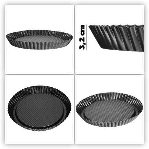 W naszej ofercie znajdziesz formę do pieczenia tarty w dwóch wersjach: w kolorze srebrnym, z blachy ocynowanej lub w kolorze czarnym z nieprzywierającą powłoką zapobiegającą przyklejaniu się ciasta do blaszki. Okrągła, karbowana forma jest dostępna w kilku rozmiarach do wyboru. Interesuje Cię przygotowywanie mini-tarty, a może wytrawnego wypieku z masą dodatków? Dopasuj średnicę do swoich planów kulinarnych!