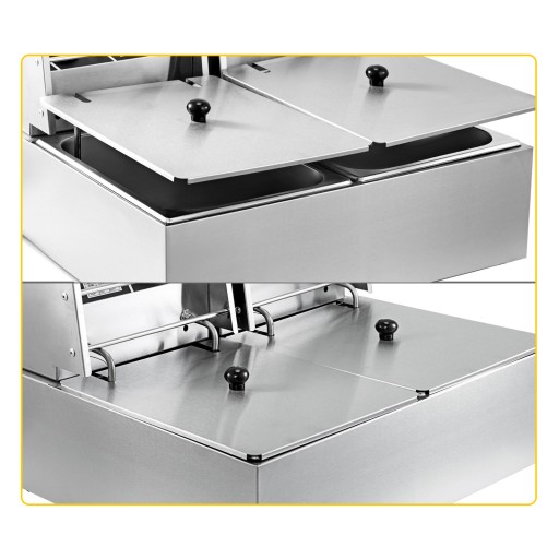 Ta dwuzbiornikowa frytownica elektryczna o pojemności 12 litrów i mocy 5000 W ma konstrukcję ze stali nierdzewnej. Jest przeznaczony do zastosowań komercyjnych, takich jak restauracje, supermarkety, sklepy typu fast food, bary z przekąskami itp. Za każdym razem smaż swoje popisowe danie do perfekcji za każdym razem dzięki tej komercyjnej podwójnej frytkownicy o pojemności 6 litrów. Wykonany z wysokiej jakości komercyjnej stali nierdzewnej i wyposażony w dwa elementy zanurzeniowe 2500 W do szybkiego nagrzewania.