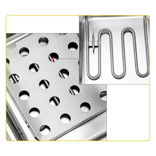 【SZYBKIE NAGRZEWANIE】-ulepszona 5-pierścieniowa rura grzewcza zapewniająca bardziej równomierne i szybsze nagrzewanie w porównaniu z 3-pierścieniowymi rurami. Przegrody zapobiegają bezpośredniemu kontaktowi kosza i rury grzewczej oraz ograniczają przywieranie resztek jedzenia. Pokrywy dołączone z uchwytem dla szybkiego nagrzewania i ochrony.