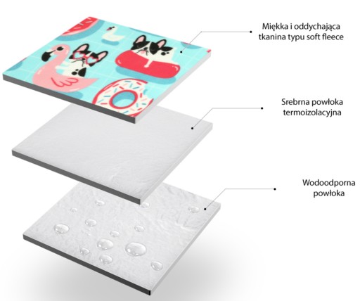 Koc został wykonany z dwóch warstw materiału. Górna to wygodny materiał Polar, który zapewnia komfort użytkowania. Dolna warstwa wykonana została z wodoodpornej powłoki aluminium. Oba te materiały tworzą świetną warstwę termoizolacyjną.
