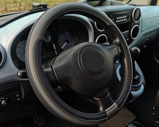 Pokrowiec na kierownicę wykonany z wysokiej jakości ekoskóry perforowanej połączonej z ekoskórą gładką.