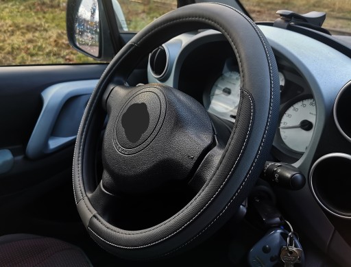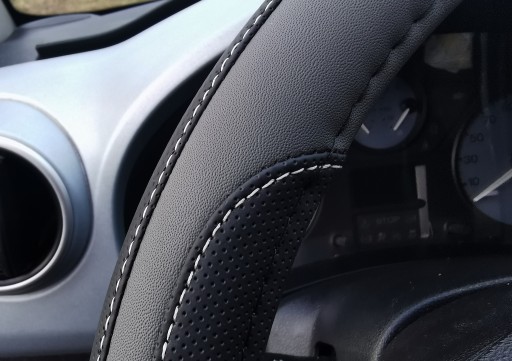 Pokrowiec na kierownicę wykonany z wysokiej jakości ekoskóry perforowanej połączonej z ekoskórą gładką.