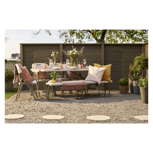 Po rozłożeniu stół osiąga wymiary 180 x 76 x 74 cm, natomiast złożony mierzy jedynie 90 x 76 x 8,5 cm. Po złożeniu części stołu blokuje się stabilnymi mocowaniami, a ponadto całość ma praktyczny uchwyt ułatwiający przenoszenie mebla pomiędzy miejscem przechowywania i użycia.