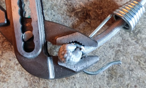 1. Otwieramy zacisk szczypcami do pierścieni, na tyle żeby dało się włożyć do środka podwójnie złożoną linkę.