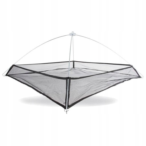 Kwardatowa podrywka o wymiarach 80X80 cm rozpięta na składanym metalowym pałąku. Podrywka posiada kołnierz o wysokości 15 cm, który zapobiega wypadnięciu ryb z siatki oraz końcówkę do zamontowania sznurka znajdującą się na wierzchołku stelarza.