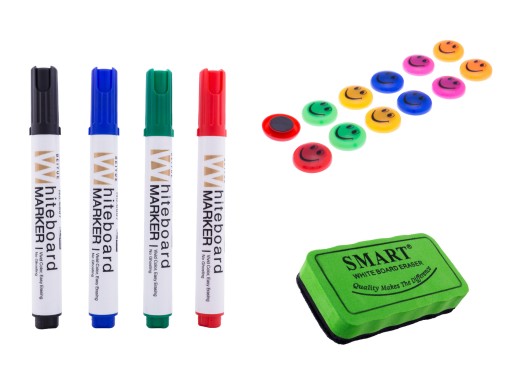 W skład zestawu wchodzą również 4 mazaki, 12 magnesów, gąbka.