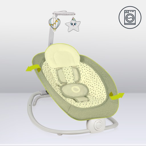 Pasy zapewniają większe bezpieczeństwo podczas bujania. Dodatkowe poduszki zwiększają komfort oraz zapobiegają otarciom wrażliwej skóry dziecka.