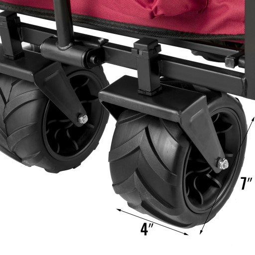 Koło wózka plażowego ma 4 cale szerokości i 7 cali średnicy i może obracać się o 360°. Może się łatwo poruszać i iść gdziekolwiek.