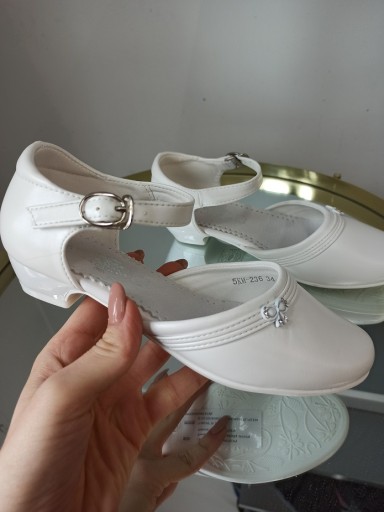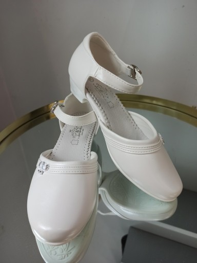 Eleganckie buty komunijne dla dziewczynki z prostą aplikacją - mała delikatna wstążka.