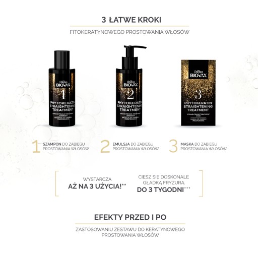 Zestaw do fitokeratynowego prostowania włosów w trzech prostych krokach pozwala cieszyć się doskonale gładką fryzurą aż do 3 tygodni, w zależności od rodzaju włosów i częstotliwości mycia. Fitokeratyna (hydrolizowane proteiny roślinne) pozwala na zdyscyplinowanie włosów ze skłonnością do puszenia się, falowanych, kręconych i zniszczonych, aby tworzyły gładką, lśniącą taflę.