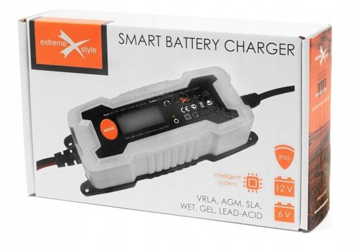 prostownik SBC-61238 marki eXtremestyle® współpracuje z różnymi akumulatorami 6 i 12 V typu: VRLA, AGM, VLA, SLA, EFB, WET, GEL, LEAD-ACID.