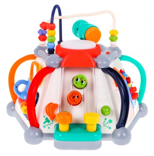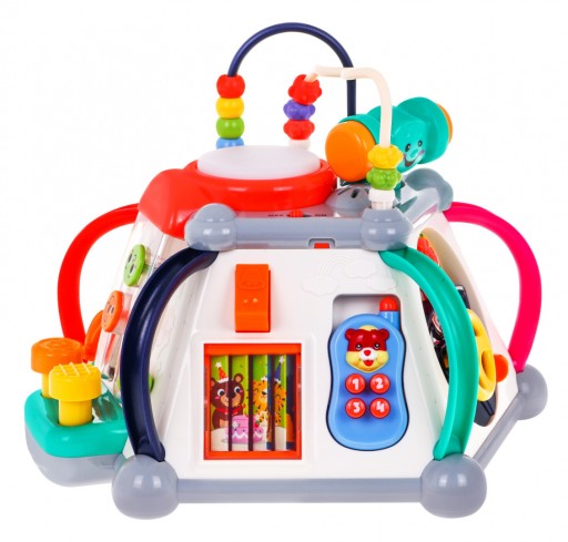 Płaszczyzna górna: - włącznik/wyłącznik całego pudełka, - młotek z gumowanymi końcami oraz miejsce na jego przechowywanie, - świecąco-grający bęben, - dwa labirynty z kolorowymi koralikami do przesuwania.