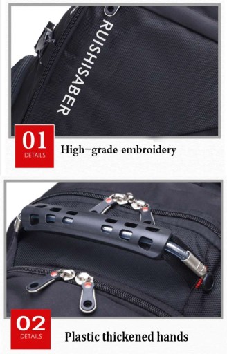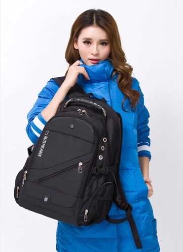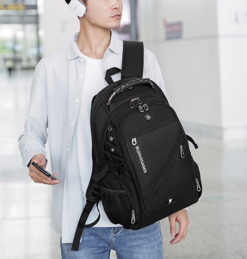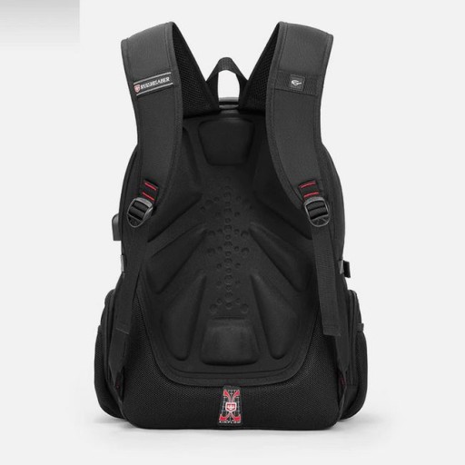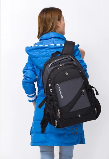 Wielofunkcyjny i bardzo pojemny plecak na laptopa wykonany z wytrzymałego na zadrapania i wodoodpornego materiału – nylonu. W tylnej komorze znajduje się kieszeń na laptopa w rozmiarze do 17,3” zapinana na elastyczny pasek z rzepem, który chroni urządzenie przed przesunięciem w plecaku. Znajdują się tutaj również dwie kieszonki np. na power bank lub telefon. Druga, przednia komora jest bardzo pojemna. Z powodzeniem zapakujesz tu ubrania na kilkudniowy wyjazd. Ponadto komora ta posiada po bokach otwory wentylacyjne. Z przodu plecaka znajduje się kieszeń z organizerem na akcesoria i drobiazgi np. karty, telefon, portfel, klucze itp. Na zewnątrz znajdują się dwie kieszonki na podręczne rzeczy zapinane na zamek, w tym jedna schowana pod rantem materiału. Po bokach plecaka również umieszczono kieszonki na drobiazgi, oraz elastyczne kieszenie na napój lub parasolkę. Tył plecaka wyłożony jest grubą, oddychającą gąbką oraz pianką ze specjalnymi wytłoczeniami na plecy, dzięki czemu jest on wygodny przy dłuższym noszeniu, a sprzęt schowany wewnątrz plecaka chroniony jest przed wstrząsami i uderzeniami. Szelki plecaka o ergonomicznym kształcie są solidnie uszyte i wyłożone miękkimi gąbkami oraz posiadają uchwyt na okulary. Plecak posiada wzmacniany uchwyt z tworzywa z tytanową linką wewnątrz, co gwarantuje bezpieczne podnoszenie nawet bardzo obciążonego plecaka. Plecak posiada również boczne zapięcia, które dodatkowe chronią zawartość. Plecak wyposażony jest w zewnętrzne gniazdo USB, dzięki czemu nie ma konieczności wyciągania power banka z plecaka, aby naładować telefon lub inne przenośne urządzenie. Projektanci plecaka pomyśleli również o melomanach i zaprojektowali dedykowany otwór na kabel słuchawkowy. Z przodu plecaka umieszczono emblemat z odblaskiem, aby poprawić bezpieczeństwo po zmroku. Plecak na laptopa 17,3” RUIBER o futurystycznym, a wręcz industrialnym wyglądzie polecamy wszystkim osobom, które szukają dużego i nowoczesnego plecaka, w którym pomieszczą wszystkie potrzebne rzeczy, urządzenia multimedialne, a nawet ubrania.