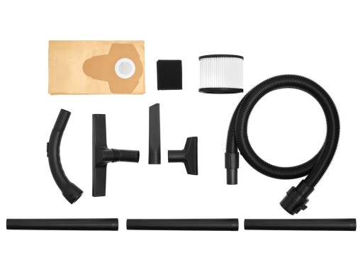 W zestawie: 1 wąż ssący, 3 końcówki, 1 uchwyt z regulacją powietrza, rura ssąca, 1 worek papierowy, 1 filtr harmonijkowy, 1 filtr piankowy
