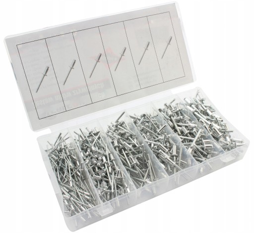 Zestaw 450 sztuk aluminiowych nitów zrywalnych z trzpieniem stalowym. Zestaw zawiera cztery najbardziej popularne rozmiary od 3.2 mm do 4.8 mm. Całość umieszczono w wygodnym opakowaniu typu "sortownik".