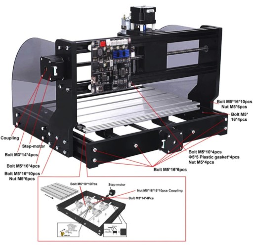Trzy osie są zaprojektowane w celu uzyskania grawerowania płaskiego. Za pomocą pokrętła osie można przesuwać ręcznie, co ułatwia ustawienie narzędzia do rzeźbienia. Jednostki składają się ze śrub T8 ze stali nierdzewnej.