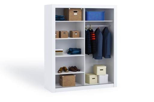 W szafie zastosowano wysokiej jakości system drzwi przesuwnych firmy "LAGUNA" w postaci rolek na łożyskach, dzięki którym drzwi płynnie i lekko przesuwają się po metalowych prowadnicach.