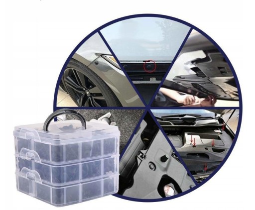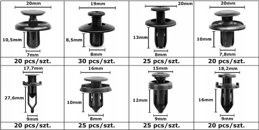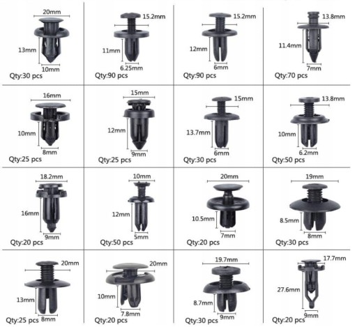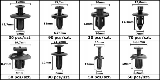 Uniwersalny zestaw spinek, kołków, zatrzasków samochodowych do mocowania tapicerki w samochodzie, błotników, zderzaków, drzwi.