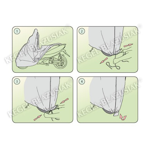 Pokrowiec należy wkładać na względnie czysty skuter białą stroną pasa środkowego do wewnątrz a następnie maksymalnie mocno zaciągnąć linkę ściągacza pokrowca i prawidłowo ją zawiązać. Tylko właściwe sznurowanie zagwarantuje wytrzymałość wiązania.