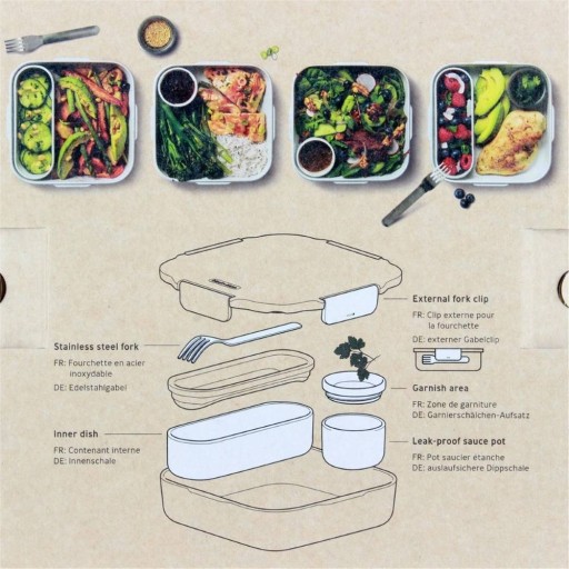 Pojemnik wykonano z polipropylenu z dodatkiem 20% włókna szklanego, a w zestawie oprócz widelca ze stali nierdzewnej znajdziesz pojemnik na sos. Materiały wykorzystane w produkcji są wolne od BPA, można je również poddać recyklingowi. Charakteryzują się trwałością, szczególnie wspomniane włókno szklane czy tritan, z którego wykonano pokrywkę.