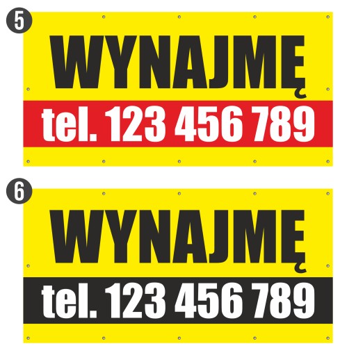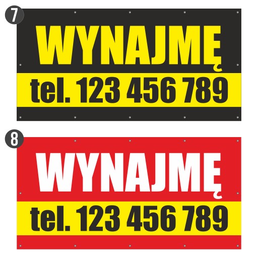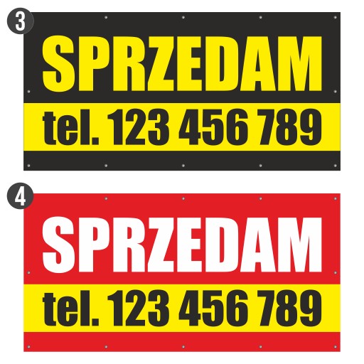 Tekst: Duże, czytelne litery z wyraźnymi hasłami „Sprzedam” i „Wynajmę”. Tekst w kolorze kontrastującym z tłem, aby był widoczny z dużej odległości.