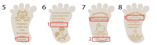 Przy zakupie usługi dodatkowego graweru (dostępnej na naszych innych aukcjach) możemy tekst ze wzoru zastąpić tekstem podanym przez kupującego. Należy wówczas pamiętać, że ilość znaków przesłanego przez klienta powinna odpowiadać ilością znaków tekstu ze wzoru.