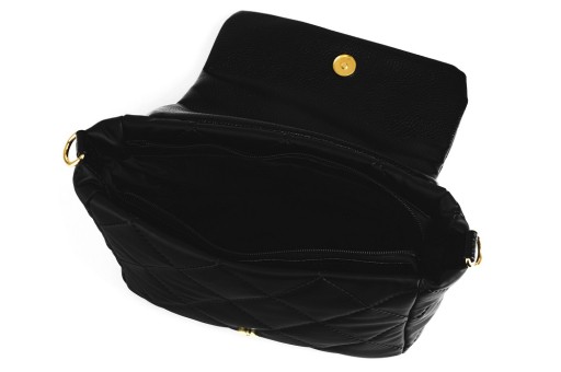 Wykonana została z wysokiej jakości pikowanej eko skóry. Zamykana jest na zamek błyskawiczny i klapką na magnes. W środku znajduję się zasuwana kieszonka na dokumenty, oraz boczna otwarta kieszonka na telefon komórkowy i inne kobiece drobiazgi. Torebka posiada logowany dopinany pasek, pozwalający noszenie listonoszki przez ramię. Pikowana faktura torebki wraz ze złotymi dodatkami z pewnością przyciągną oko niejednej kobiety. Gorąco polecam.