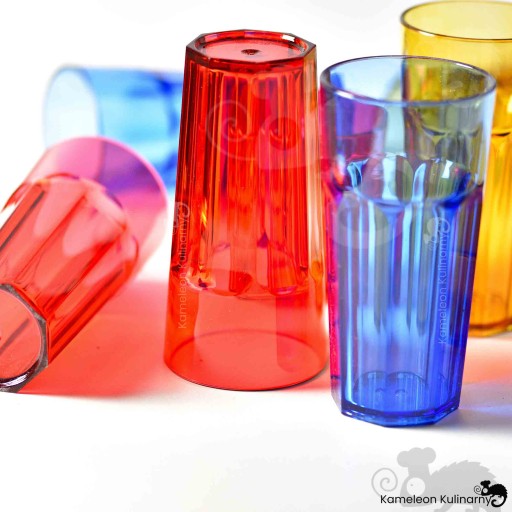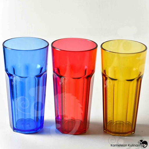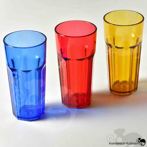 SERIA KOLOROWYCH SZKLANEK z poliwęglanu to nietłukące, super praktyczne SZKLANKI w 3 kolorach. Podczas słonecznego dnia czy też naczyń używanych w ogrodzie - możemy nadać stołowi dużo blasku, koloru, refleksów. Wprowadzają nie tylko kolor, ale dużo energii. Poza tym - są bezpieczne bo nietłukące. Można je dzięki temu wziąć do ogrodu, na grilla, do basenu bez obaw o uszkodzenie czy potłuczenie. Dostępne są w 2 wielkościach 250 i 360ml, w 3 kolorach: niebieski, czerwony i brąz (nazywany czasem złotym).