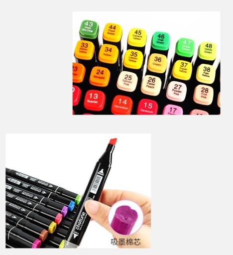 Każdy marker oznaczony jest numerem oraz kolorem dzięki czemu bez problemu wybierzesz właściwy. Pigmentacja jest bardzo intensywna. Twoje prace nabiorą wyjątkowego charakteru. Możesz bez problemu dokładać kolejne warstwy aby jeszcze bardziej podbić kolor. Markery alkoholowe różnią się od zwykłych markerów i są od nich lepsze choćby pod względem możliwości tonowania i łączenia kolorów.