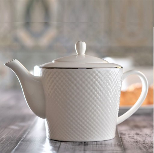 to niezwykle elegancka kolekcja wykonana z cienkiej i delikatnej porcelany kostnej o ciepłym, mlecznym odcieniu bieli. Serwis do herbaty i cała kolekcja zachwyca swoją klasyczną formą, pełną lekkości i finezji. Serwis do herbaty i pozostałe elementy kolekcji wyróżnia wyjątkowe zdobienie, strukturalny wzór na powierzchni wszystkich naczyń i na skrzydłach talerzy i półmisków. Platynowa linia na obrzeżu, malowana ręcznie, subtelnie podkreśla jej wyjątkowy charakter.