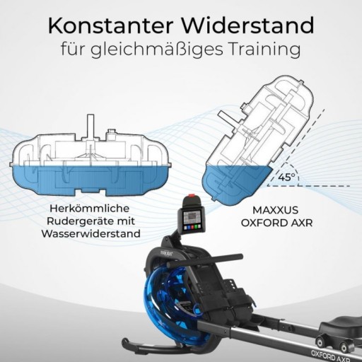 Dla wioślarzy woda jest ich żywiołem. Dzięki MAXXUS OXFROD AXR możesz teraz przenieść to realistyczne uczucie wiosłowania do domu. Umożliwia to wysokiej jakości, niezniszczalny zbiornik na wodę.Aż 6 różnych poziomów napełnienia, które użytkownik może szybko i łatwo zmieniać za pomocą systemu pomp, Umożliwia stałe dostosowanie oporu podstawowego do poziomu wydajności użytkownika. Nie ma potrzeby ręcznego dostosowywania poziomu trudności podczas treningu. Użytkownik sam określa opór prądu poprzez użycie siły.