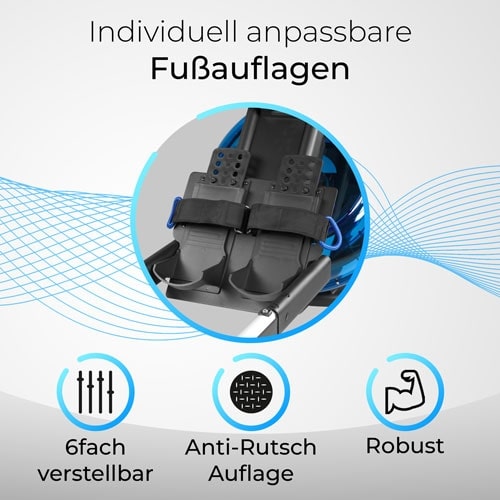 Jednym z najważniejszych punktów skutecznego, mocnego i równomiernego ruchu wiosłowego jest idealne trzymanie stóp.W OXFORD AXR rozmiar uchwytów na podnóżki można regulować 6 razy. Dlatego rozmiary butów od 34 do 48 znajdują idealne dopasowanie. Aby wykonać ruch powrotny, stopa musi być mocno połączona ze wspornikiem. To mocne trzymanie gwarantują szerokie paski na rzepy, które można optymalnie zapiąć za pomocą dwóch niebieskich uchwytów. Podnóżki z przodu posiadają antypoślizgowe elementy, które zapewniają dodatkowe wsparcie.Oczywiście uchwyty są elastyczne w kierunku wzdłużnym, dzięki czemu stopa może poruszać się optymalnie wraz z ruchem wioślarza do przodu i do tyłu.Dzięki odległości 16,5 cm (od środka do środka) podnóżki buta OXFORD AXR zapewniają idealny rozstaw stóp.W pozycji pionowej OXFORD AXR zajmuje mniej niż 0,4 metra kwadratowego.To sprawia, że OXFORD AXR to dobry wybór, nawet jeśli nie masz dużo miejsca.